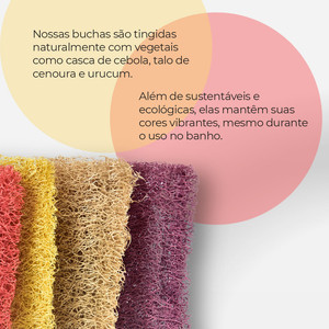 Nossas buchas são tingidas naturalmente com vegetais como casca de cebola, talo de cenoura e urucum. Além de sustentáveis e ecológicas, elas mantêm suas cores vibrantes, mesmo durante o uso no banho.